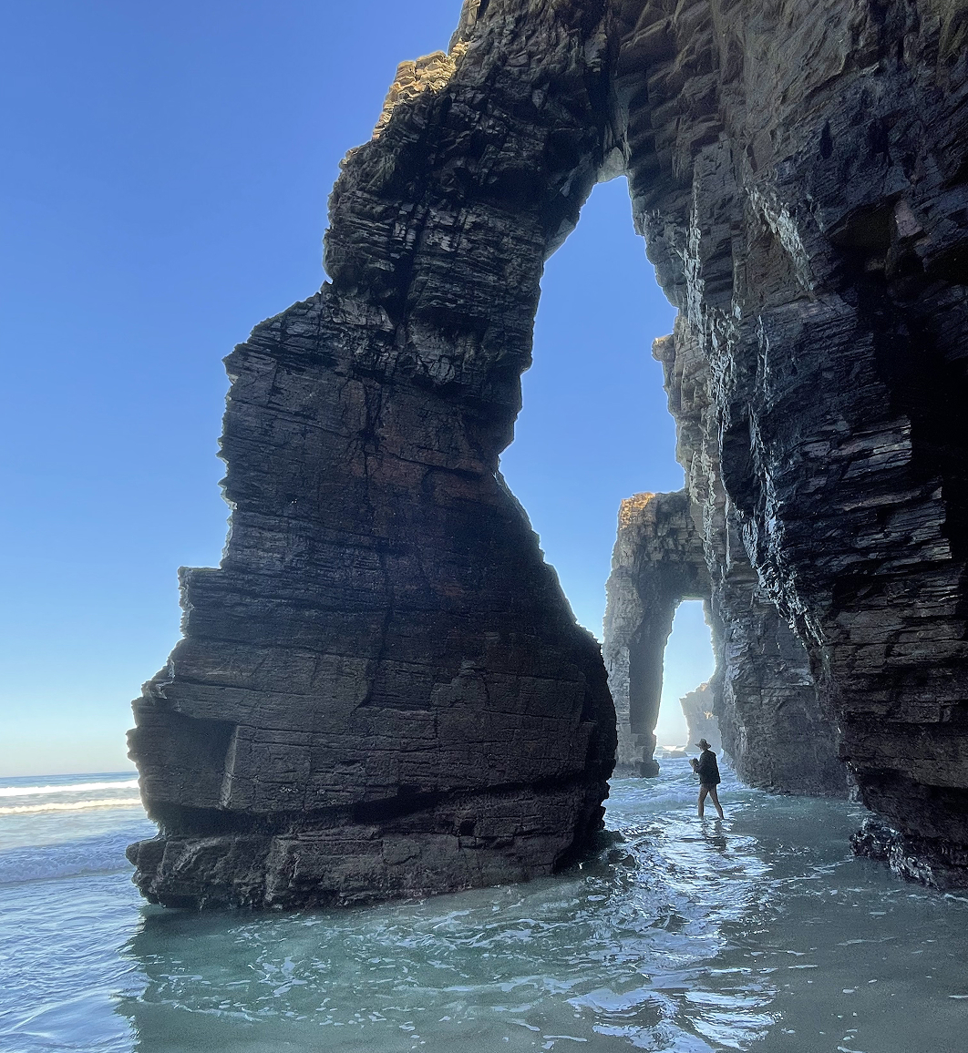 Сегодня мы исследуем северное побережье — средневековые городки и обрывы над океаном. Проезжаем Pontedeume, старинный мост через реку Eume, и деревушку Mondoñedo, словно вышедшую из старинной сказки, с её собором и ароматными булочными. Здесь, среди тихих двориков и запаха моря, время словно замирает. Дальше путь ведёт нас на знаменитую мануфактуру Sargadelos, где фарфор становится настоящим искусством: каждая чашка и тарелка хранит след мастера и немного галисийской магии. В нужный час, когда отлив открывает каменные врата, мы окажемся на Praia das Catedrais — скалах, похожих на огромный собор, где волны веками вырезали арки и колонны. Вечером приезжаем в Lugo, старинный римский город Lucus Augusti, и гуляем по римским стенам — единственным полностью сохранившимся в мире. Представляете? Даже в Италии такого нет. И, конечно, снова — вкусное и ещё вкуснее, ведь гастрономия всегда с нами.